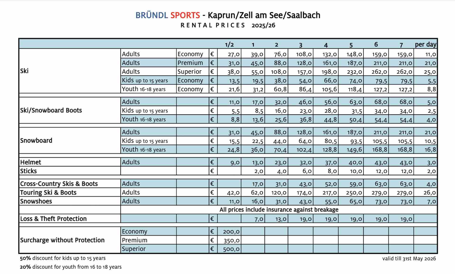 If both parents hire their equipment from Bründl Sports, children up to the age of 10 receive the equipment including helmet free of charge for the same period.